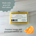 Orange Patchouli Ingredients:  grass fed beef tallow, water, lye, coconut oil, olive oil, hempseed oil, castor oil, orange and patchouli essential oils, chamomile flower